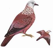 描述:体型中等(38厘米)的褐灰色鸽。翼覆羽多具白点。与其他所有鸽种的区别在颈部羽毛形长而具端环,体羽无金属光泽。头灰,上背紫酱色,下背灰色。