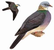 描述:中等体型(35厘米)的灰色鸽。特征为后枕具宽阔的皮黄色而带黑色鳞状斑的颈环。上背呈淡紫色及绿色闪光。头部灰色较上体浅;胸灰,渐变为灰白色的臀;颏白。