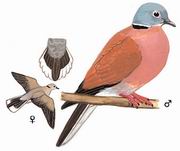 描述:体小(23厘米)的酒红色斑鸠。特征为颈部的黑色半领圈前端白色。雄鸟头部偏灰,下体偏粉,翼覆羽棕黄。初级飞羽近黑,青灰色的尾羽羽缘及外侧尾端白色。雌鸟色较浅且暗,头暗棕色,体羽红色较少。