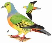 描述:中等体型(29厘米)的绿鸠。黑色的翼上具醒目的黄色纵纹和翼缘。脸前部绿色,颈背及上背灰色。雄鸟下体黄绿,上胸淡紫,下胸橘黄;雌鸟胸部绿色。尾灰色,外侧尾羽具黑色次端斑。