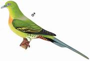 描述:中等体型(30厘米,尾长达十多厘米)的绿鸠。修长的针形中央尾羽为本种识别特征。雄鸟:尾下覆羽黄褐,胸淡沾橘黄。雌鸟:胸浅绿,尾下覆羽白色并具深色纵纹。