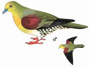 描述:中等体型(33厘米)的绿鸠。特征为腹部近白色。腹部两侧及尾下覆羽具灰斑。雄鸟翼覆羽绛紫色,上背偏灰,头顶橘黄。雌鸟以绿色为主。眼周裸皮偏蓝。