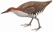 描述:中等体型(29厘米)带棕色顶冠的秧鸡。背多具白色细纹,头顶栗色,颏白,胸及背灰,两翼及尾具白色细纹,两胁及尾下具较粗的黑白色横斑。