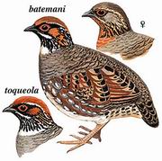 描述:雄鸟:中等体型(29厘米)的橄榄褐色山鹧鸪。头顶及枕部栗色;耳羽棕黄;眼先及眉纹黑色,其上有一白线;下颊纹白色,前颈及胸之间有一白色带。亚种batemani颈具两栗色带黑色细纹。雌鸟胸部褐色,颏及喉栗色,头顶橄榄褐色带白斑。