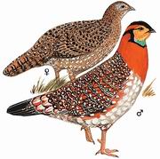 描述:雄鸟:体大(68 厘米),猩红色颈及眉线与黑色头部成明显反差的角雉。黄色脸颊裸皮为本种特征。肉垂及肉质角蓝色。下体鳞斑状的胸、腹部有别于其他角雉。亚种molesworthi的雄鸟上体色深,下体的红色仅限于狭窄的颈项,下体余部淡灰。雌鸟体小,褐色斑驳,似红胸角雉及红腹角雉的雌鸟,但色淡。