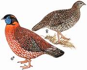 描述:体大(68厘米)而尾短。雄鸟绯红,上体多有带黑色外缘的白色小圆点,下体带灰白色椭圆形点斑。头黑,眼后有金色条纹,脸部裸皮蓝色,具可膨胀的喉垂及肉质角。与红胸角雉区别在于下体灰白色点斑较大且不带黑色外缘。雌鸟较小,具棕色杂斑,下体有大块白色点斑。