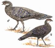 描述:雄鸟:形小(75厘米)的褐灰色雉类。喉近白色,上背及尾上有大型的紫绿色眼斑。冠羽前翻如刷。脸颊裸皮近粉色。下体具黄白及深褐色横斑。雌鸟型小,无羽冠,眼斑小而尾短。