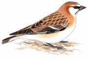 描述:中等体型(15厘米)的褐色雪雀。眼先黑色,脸侧近白。雄雌同色。成鸟头部图纹特别,髭纹黑,颏及喉白,颈背及颈侧较所有其他雪雀的栗色均重,覆羽羽端白色。幼鸟色较黯淡,但较淡栗色的耳羽已可见。亚种isabellina较色淡,上体近灰而略沾皮黄色。