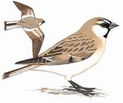 描述:中等体型(15厘米)的褐色雪雀。头部具特别的黑白色图案。雄雌同色。成鸟具黑色的眼先、颏、胸兜斑块、额中心纹及上扬至眼上后方的特征性短"角"。下体偏白。幼鸟色暗且淡而少黑色,但比棕颈雪雀脸白。亚种barbata上体灰色较浓,无姜黄色调;亚种ventorum色更淡,颈背两侧略沾黄色。