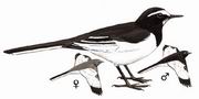 描述:体大(20厘米)的黑白色鹡鸰。上体多黑色,额、颏及眉纹白,下体白,两翼黑而具白色横斑及羽缘,尾黑而边缘白色。