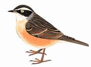 描述:体型略小(15厘米)的褐色具暗黑色纵纹的岩鹨。白色的眉纹粗显,下体白色,胸及两胁沾粉色。不同地理亚种在色调上有异,色最淡的亚种见于昆仑山。