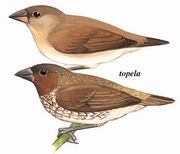描述:体型略小(10厘米)的暖褐色文鸟。雄雌同色。上体褐色,羽轴白色而成纵纹,喉红褐,下体白,胸及两胁具深褐色鳞状斑。亚成鸟下体浓皮黄色而无鳞状斑。亚种subundulata色较深,腰橄榄色;topela胸部的鳞状斑甚为模糊。