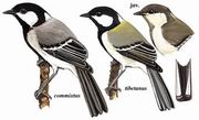 描述:体大(14厘米)而结实的黑、灰及白色山雀。头及喉辉黑,与脸侧白斑及颈背块斑成强对比;翼上具一道醒目的白色条纹,一道黑色带沿胸中央而下。雄鸟胸带较宽,幼鸟胸带减为胸兜。6个亚种略有差别,见于中国极北地区的亚种 kapustini下体偏黄而背偏绿。此亚种易与绿背山雀混淆,但分布上无重叠且绿背山雀具两道白色翼纹。