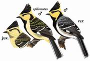 描述:体大(14厘米)的山雀。冠羽显著,头部具黑色及黄色斑纹。体羽余部于亚种rex为黑、灰及白色,指名亚种上背及下体沾黄。雌鸟:多绿黄色,具两道黄色的翼纹。亚成鸟下体黑色较少。