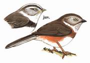 描述:体小(12厘米)的山雀。灰色的喉与白色上胸对比而成项纹;顶冠两侧及脸银灰,颈背皮黄褐色,头顶及上体褐色;尾褐色而侧缘白色,具灰褐色领环,两胁棕色;下体余部白色。幼鸟色浅,额及顶冠纹白色。