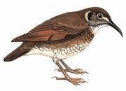 描述:中等体型(25厘米)的深褐色而尾甚短的地鸫。嘴长而略下弯,上体深红褐。初级飞羽的近红色斑块与覆羽及上背的深褐色成对比。眼先及头侧有浅色而呈扩散形斑纹。深色月牙形耳羽不如其他褐色型地鸫明显,外侧尾羽羽端无白色。