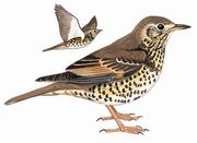 描述:体大(28厘米)的褐色鸫,下体皮黄白而密布黑色点斑。与欧歌鸫的区别在体型较大,上体褐色较浓,外侧尾羽端白,翼下白。覆羽边缘白色。雌鸟似雄鸟。