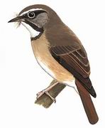 描述:体小(13厘米)的橄榄褐色鹟。特征为颏及喉白色且成胸兜,缘以黑色的髭纹及项纹。眉纹白,翼及尾偏红,胸及两胁沾皮黄。指名亚种眉纹皮黄。