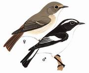 描述:体小(12厘米)的黑白两色或褐色及白色的鹟。雄鸟:上体黑色,白色的眉纹宽而长,翼斑及尾基部羽缘白色,下体白。雌鸟:上体灰褐,翼斑皮黄,下体近白。与锈胸蓝[姬]鹟的区别为胸腹部中央部位较白而成一浅色中带。亚成鸟褐色并具黄褐色杂斑。