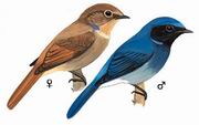 描述:体小(14厘米)的深色鹟。雄鸟深蓝,脸侧及喉黑,臀白,前额、颈侧及腰为闪辉蓝色。与大仙鹟的区别在体型较小,胸蓝色,臀白色。雌鸟褐色,翼及尾棕色,颈侧具闪辉蓝色斑块,喉皮黄,项纹浅皮黄。与大仙鹟的区别在体型较小,颈背褐色,项纹色浅。