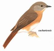 描述:雄鸟:中等体型(15厘米)的近褐色鹟。头近灰,胸及两胁棕色,喉白。亚种cachariensis的喉浅橘黄,头无灰色调,与雌山蓝仙鹟易混淆。雌鸟:褐色,喉白,胸带棕色;似雌蓝喉仙鹟但翼及尾较少棕色。