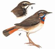 描述:雄鸟:中等体型(14厘米)的色彩艳丽的歌鸲。特征为喉部具栗色、蓝色及黑白色图纹,眉纹近白,外侧尾羽基部的棕色于飞行时可见。上体灰褐,下体白,尾深褐。雌鸟喉白而无橘黄色及蓝色,黑色的细颊纹与由黑色点斑组成的胸带相连。与雌性红喉歌鸲及黑胸歌鸲的区别在尾部的斑纹不同。诸亚种的区别在喉部红色点斑的大小(亚种 abbotti最小)、蓝色的深浅度(亚种 saturator深,svecica浅)以及在蓝色及栗色胸带之间有无黑色带(svecica)。幼鸟暖褐色,具锈黄色点斑。