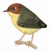 描述:体小(10厘米)、立姿甚直而色彩艳丽的莺。尾短而似鹪鹩,特征为头及颈背栗色。上体绿色,下体黄色,眼上后方有一白点。幼鸟上体橄榄褐色,下体橙栗。亚种abadiei的上体绿色较深,颈背近绿;repleyi较指名亚种色淡。