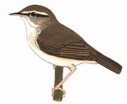 描述:体型略小(12. 5厘米)的橄榄褐色树莺。上体无棕色,眉纹皮黄,下体白,两胁及臀淡皮黄。特征为脚浅肉色而尾近方形。野外不易识别,但与褐柳莺的区别在眉纹及两胁不沾棕色。与鳞头树莺的区别在尾较长且冠羽无深色羽缘。