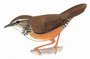 描述:中等体型(13.5厘米)的单褐色莺。两翼短宽,眉纹苍白;上体褐色,顶冠沾棕;下体偏白,喉具深色点斑,胸带灰色,两胁偏褐;尾下覆羽褐色,羽端白而成宽锯齿形。喉部的黑色点斑于春季甚醒目构成完整项纹,但冬季极淡,在亚种przevalskii几乎全无。比巨嘴短翅莺的嘴较短且直,眉纹也少扩展。亚种davidi 色较深,亚种przevalskii色较指名亚种淡。