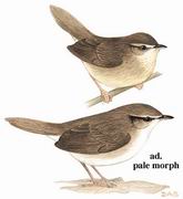描述:中等体型(14厘米)的褐色莺。具浅色的下体和眉纹,眼先白,尾略长而凸。上体全褐;下体从白色至黄色有变化,胸侧及两胁皮黄褐,喉及上胸或有或无褐色点斑。尾下覆羽淡褐,浅色的宽羽端成宽锯齿形纹理。与夏季斑胸短翅莺的区别在上体橄榄褐色较浅,胸无灰色,喉部点斑较少且点斑褐色而非黑色,下嘴色较淡。与冬季斑胸短翅莺的区别在尾下锯齿形纹理反差不甚强且下体有时沾黄。与高山短翅莺的区别在上体色淡,颈侧及胸部的褐色较重且嘴细而色淡。与棕褐短翅莺的区别在尾下覆羽色淡,下体略沾黄,胸侧较少褐色。