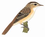 描述:中等体型(13厘米)的苇莺。上体赭褐,顶冠及上背具模糊的纵纹。下体皮黄,喉偏白。脸颊近黄,眉纹皮黄而上具黑色的宽纹。比黑眉苇莺上体色淡且纵纹较多,嘴显粗而长。