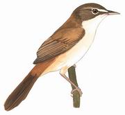 描述:中等体型(14厘米)的单调棕褐色无纵纹苇莺。两翼短圆,白色的短眉纹几不及眼后。上体深橄榄褐色,腰及尾上覆羽棕色。具深褐色的过眼纹但眉纹上无深色条带。下体白,胸侧、两胁及尾下覆羽沾皮黄。与稻田苇莺及远东苇莺的区别在眉纹较短,且无第二道上眉纹。