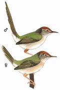 描述:体小(12厘米)的棕顶冠而腹白的莺。尾长而常上扬;额及前顶冠棕色,眼先及头侧近白,后顶冠及颈背偏,;背、两翼及尾橄榄绿色,下体白而两胁灰。于繁殖期雄鸟的中央尾羽由于换羽而更显延长。亚种inexpectatus 的脸颊及耳羽无细纹;longicauda的上体色深。