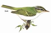 描述:中等体型(12厘米)的黄橄榄色柳莺。具近白的眉纹和顶纹;上体绿橄榄色,飞羽具黄色羽缘,仅一道黄白色翼斑;下体近白,与柠檬黄色的臀成对比;眼先及过眼纹近黑。与冠纹柳莺的区别在仅一道翼斑,嘴较大,顶纹及眉纹更显黄色。