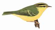 描述:中等体型(10.5厘米)而色彩鲜艳的柳莺。上体亮绿色,下体及眉纹鲜黄色。通常可见两道翼斑。眼纹及侧顶纹黑绿色,顶纹近黄,颈背具灰色细纹。似黄胸柳莺但整个下体全黄。侧冠纹比海南柳莺深许多。较金眶鹟莺少黄色眼圈。
