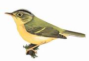 描述:体小(13厘米)的偏黄色莺。具宽阔的绿灰色顶纹,其两侧缘接黑色眉纹;下体黄;外侧尾羽的内翈白色。眼圈黄色有别于白眶鹟莺和灰脸鹟莺。有些亚种具一道黄色翼纹。