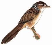 描述:体大(17厘米)而具明显纵纹的草莺。略黑的尾长而凸;三级飞羽色深;近黑色的头顶、颈背及上背具棕色及白色纵纹,眉纹偏白。脸及下体偏白,胸两侧及两胁棕褐;尾下覆羽皮黄具深色细纹。外侧尾羽羽端的白色较宽。冬季新体羽褐色较浓重,因上体羽缘具褐色毛边。外表似沼泽大尾莺但体型较小,尾较短且圆。