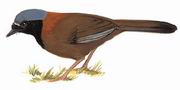 描述:体型略小(23厘米)的噪鹛。眼罩及喉部黑色,颈侧具特征性的栗褐色块斑。顶冠灰色,尾偏黑,下腹部及尾下覆羽棕色。体羽余部橄榄灰色,初级飞羽羽缘浅灰。