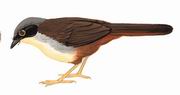 描述:体型略小(23厘米)的褐色噪鹛。眼罩黑,下体黄。顶冠、颈背及胸侧灰色,下腹、尾下覆羽及尾羽羽缘棕色。与黄喉噪鹛的区别在臀部色彩的不同且尾无白色羽缘。