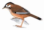 描述:体型略小(22厘米)而具醒目图纹的噪鹛。头顶、颈背、眼后纹、髭纹及颈侧细纹黑色。指名亚种及strnuus的眼先及脸颊近白至浅皮黄色;指名亚种体羽偏红色较多,且头顶及颈背近黑至灰褐。初级覆羽黑色,初级飞羽羽缘灰色。三级飞羽、次级飞羽及尾羽羽端黑色而具白色的月牙形斑。与白颊噪鹛的区别在尾部及翼上图纹。