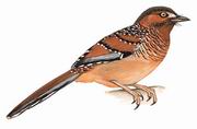 描述:体大(34厘米)而具明显点斑的噪鹛。尾长,顶冠、颈背及髭纹深灰褐色,头侧及颏栗色。背羽次端黑而端白因而在栗色的背上形成点斑。两翼及尾部斑纹似眼纹噪鹛。与眼纹噪鹛的区别在体型甚大而尾长,且喉为棕色。
