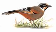 描述:中等体型(26厘米)噪鹛。脸部黑白色的图纹明显,翼上具多彩图纹。体羽大致灰褐,臀栗色。尾基黑色,尾端灰而具狭窄的白边。