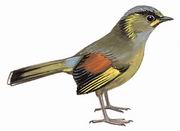 描述:中等体型(18厘米)的薮鹛。顶冠及颈背灰而带近白色细纹,眼先具月牙形黄斑,眉纹黑而后端黄。背橄榄褐色,腰灰;方形的尾橄榄色,具深青石灰色的次端斑,末端具狭窄白色;次级飞羽栗色,羽端深青石灰色;初级飞羽黑色,羽缘黄色;下体灰,下胸黄橄榄色,臀黑且羽尖的亮黄色成鳞状斑纹。