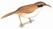 描述:中等体型(23厘米)的褐色钩嘴鹛。下体白或皮黄,喉及眉纹白,嘴为特征性猩红色。与红嘴钩嘴鹛的区别在白色的眉纹上无黑色线条;胸白(亚种stenorhynchus为暖皮黄色),嘴多橙红色且较细长。