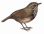 描述:体型略大(19厘米)的深灰褐色鹪鹛。上体具深色鳞状纹,喉白而具黑色纵纹,腹部橄榄灰色而具近白色的纵纹,眼后通常有灰色眉纹。较短尾鹪鹛体大而尾长。