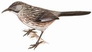 描述:体大(31厘米)的灰褐色多纵纹的鹛。具大而略弯的嘴和浅色的眼部。似矛纹草鹛但体大而灰色重,尾较黑,嘴较长而弯曲,下体基色较白。
