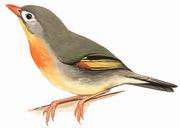 描述:色艳可人的小巧(15.5厘米)鹛类。具显眼的红嘴。上体橄榄绿,眼周有黄色块斑,下体橙黄。尾近黑而略分叉。翼略黑,红色和黄色的羽缘在歇息时成明显的翼纹。