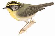 描述:体小(10厘米)的雀鹛。头部图纹别致--黄色的喉和眉纹,黑色的宽眼纹,以及宽阔的黑色侧顶纹。上体橄榄灰色,头顶具黑色鳞状斑,下体黄而两胁灰。