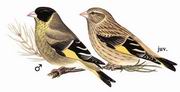 描述:体小(13厘米)的偏黄色雀鸟。头黑绿色,似高山金翅[雀]但头无条纹,腰及胸橄榄色而非黄色。似金翅[雀]但绿色甚浓重而无暖褐色调。幼鸟较成鸟色淡且多纵纹,似高山金翅[雀]及金翅[雀]的幼鸟但色深且绿色重。