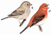 描述:体型略小(15厘米)而头红的朱雀。上体灰褐,腹白。繁殖期雄鸟头、胸、腰及翼斑多具鲜亮红色,随亚种而程度不同--roseatus几乎全红;grebnitskii下体淡粉红。雌鸟无粉红,上体清灰褐色,下体近白。幼鸟似雌鸟但褐色较重且有纵纹。雄鸟与其他朱雀的区别在红色鲜亮。无眉纹,腹白,脸颊及耳羽色深而有别于多数相似种类。雌鸟色暗淡。